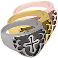 Men's Cross Ring- Black wholesale pet jewelry shown in silver and gold Sterling Silver Men's Cross Cremation Ring Black Front shown of Men's Cross Ring- Black urn jewelry Urn compartment shown on top of memorial urn ring |