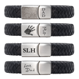 This masculine, heavy duty woven leather band features a sturdy stainless steel fitting that is personalized with your choice of engraving to create a one of a kind keepsake. Engraving orientation on the small side of the clasp (vertical stacked vs vertical) will be at the discretion of the engraver based on the number of characters entered for engraving unless otherwise requested.
