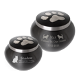 Wholesale Pet Cremation Urns: Furry Friend Paw Print -2 sizes available Item Number: 8308 These popular pet cremation pot-style urns are made of solid brass with a brushed finish. The dark slate urn has a contrasting silver pawprint on the top and silver lining on the lid's edge. A threaded lid keeps the cremated ashes tightly sealed in. You can also permanently seal the urn using epoxy or superglue. Personalization can be added to the front to make an extra special memorial for your beloved companion. Sizes: Small 4.4" tall x 5" diameter | approx. 34 cubic inches of ash Medium: 5" tall x 6" diameter | approx. 68 cubic inches of ash
